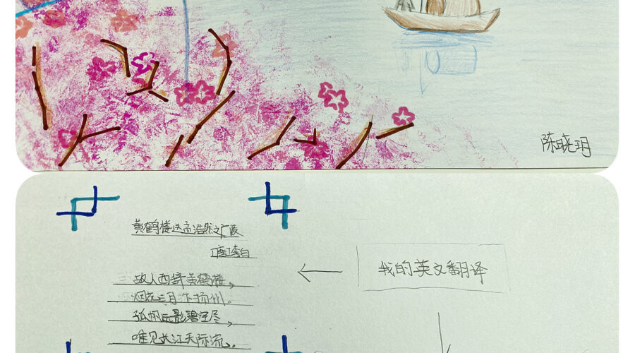 practicing and re-editing each other’s works, they chose one poem from their research, translated it, and tried their best to make it beautiful in meaning, rhyming, and form. Also, we were grateful that our MS English teacher, Mr. Stephan joined to help check their translations and shared his ideas. Students were very happy to display their works in Chinese-style posters, and they even created excellent videos to record their reading. Please enjoy it!